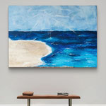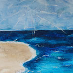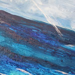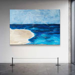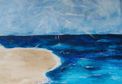 Dieses Werk ist mit Strukturpaste, Sand gefertigt, daher sieht man die 3D Strukturen in den Wellen. Die unterschiedlichen Blautöne laden Dich zum Träumen ein.