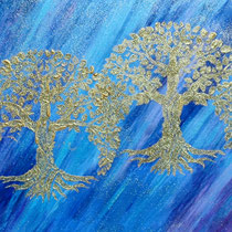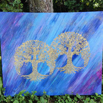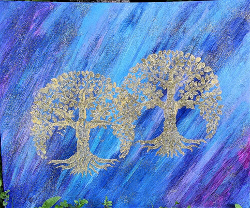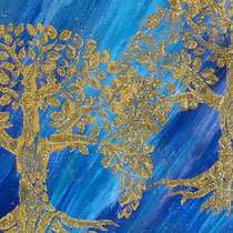 Die Schattierungen gehen von Blautönen in Lilatöne über, das gibt diesem Seelenbild eine Energie der Transformation und Ruhe. Da ich es liebe Gold in meinen Bilder zu integrieren, sind zwei goldene Bäume auf dem Bild.